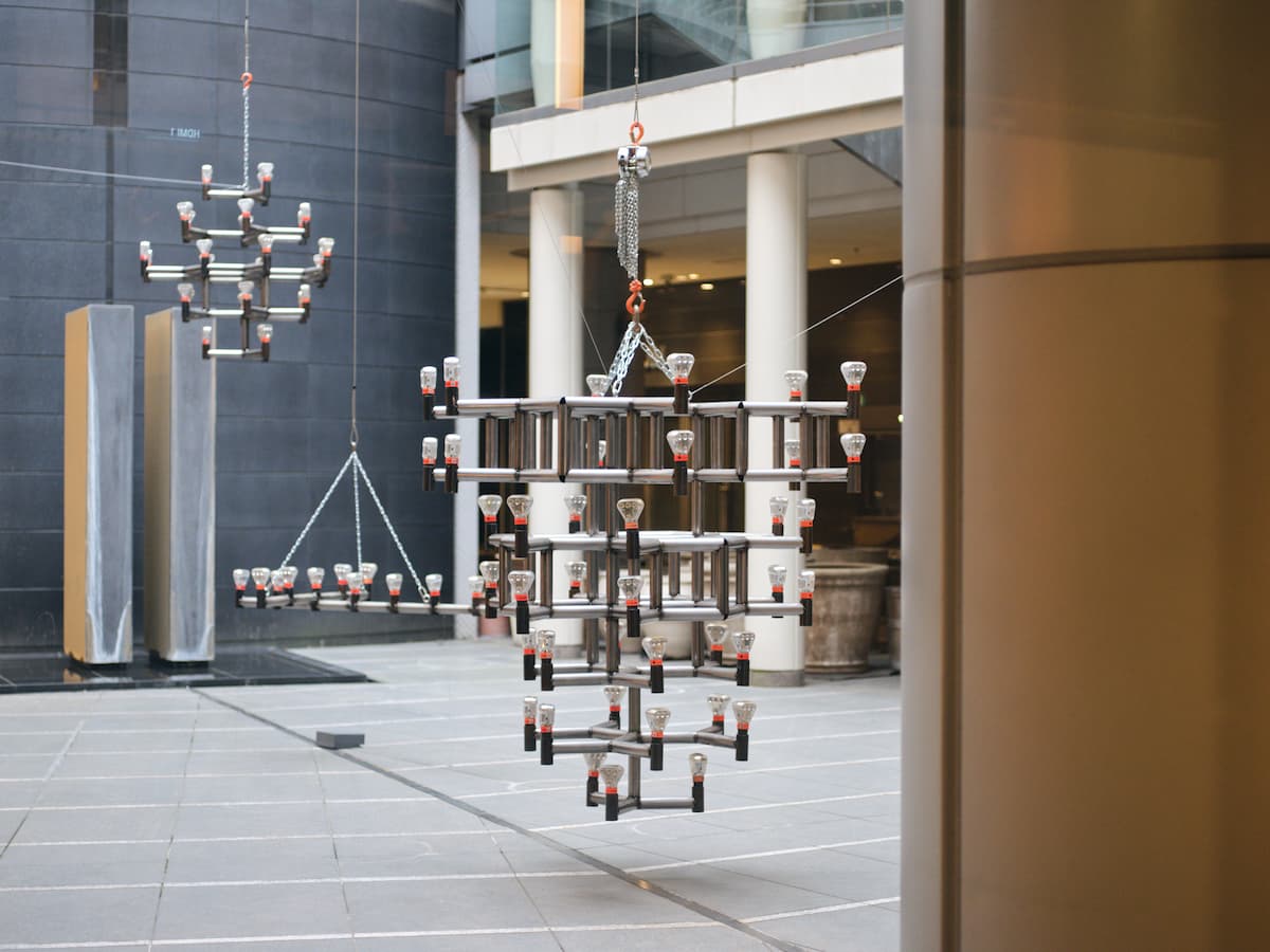 松下は、そうも付け加える。今回展示された大型立体作品『rode work shibuya』は、シャンデリアのような構造体に「仙台銘板」という会社の照明機材を取り付けたものだ。これは東日本大震災以降、全国的に増えた工事用の照明だという。